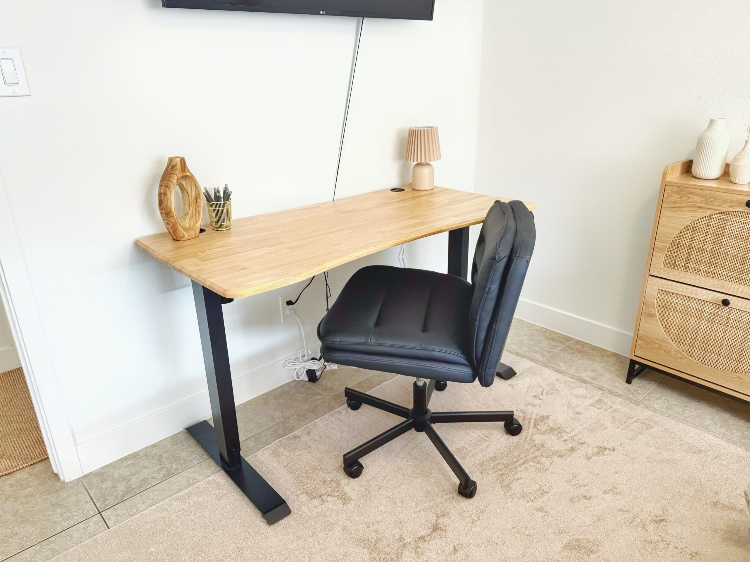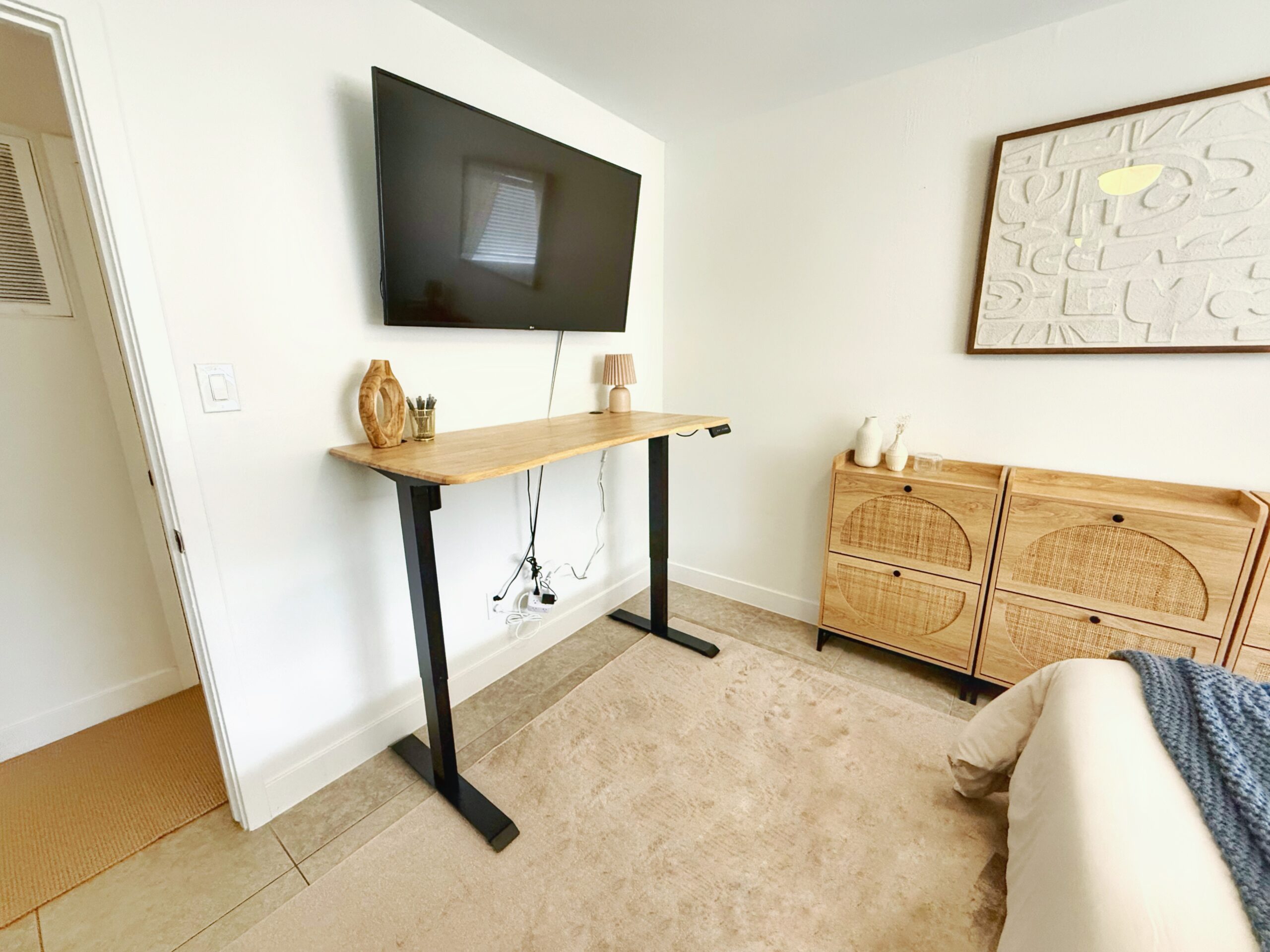 One of the bedrooms also serves as a work station, with a comfy desk chair and adjustable desk so it can be a sitting desk, or standing desk by the push of a button.